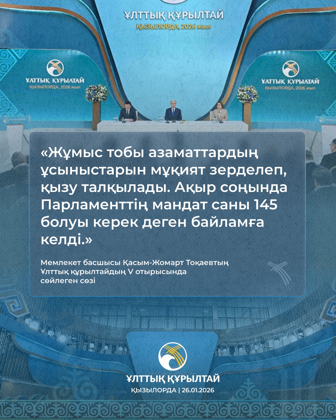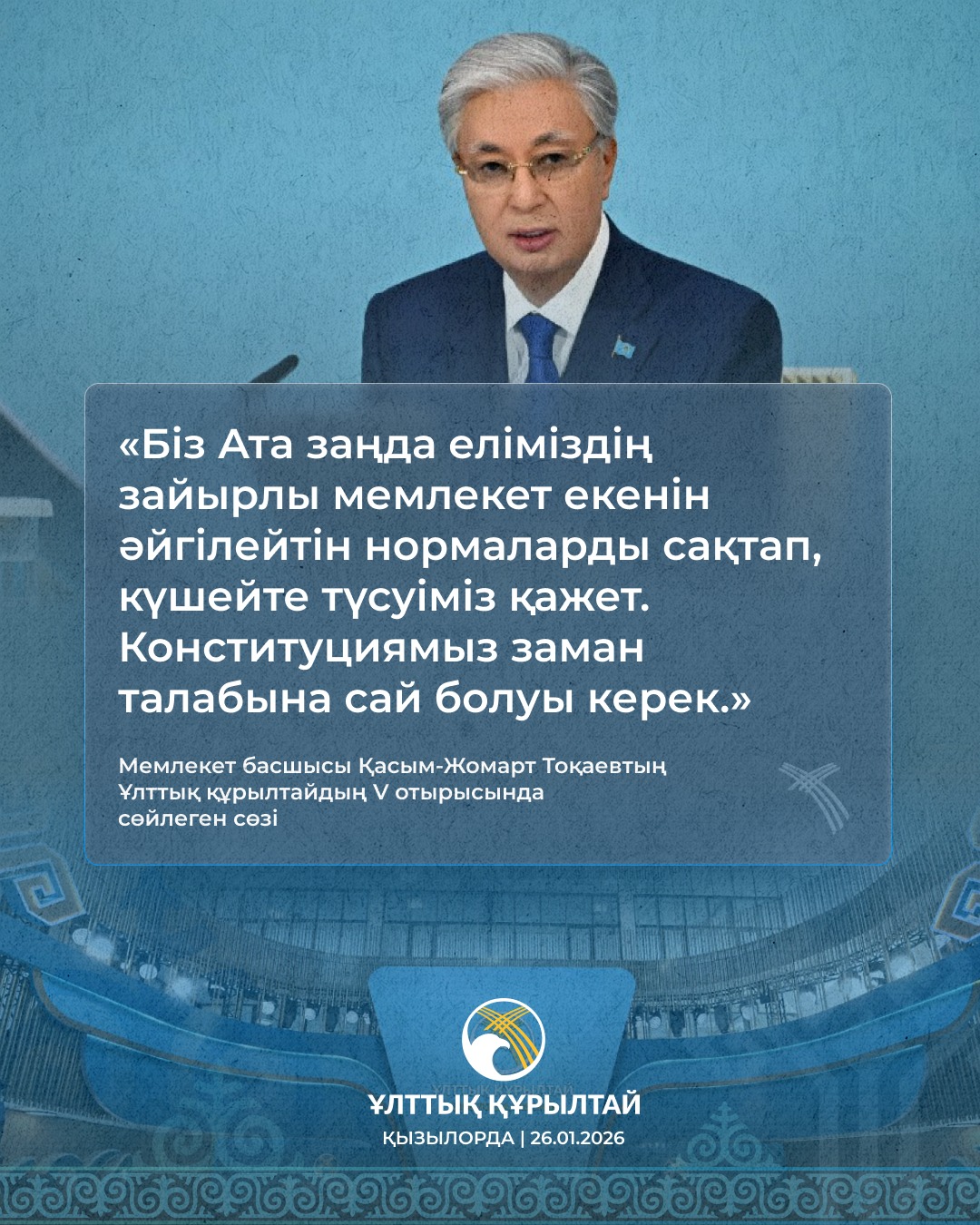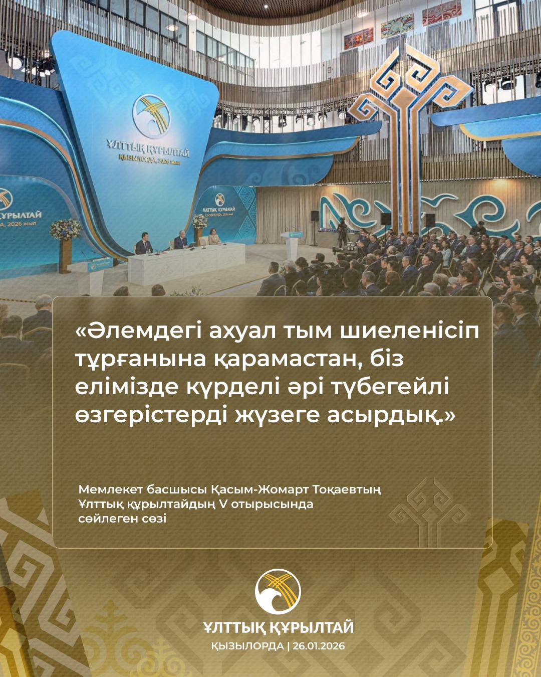 2026 жылғы 20 қаңтарда Қазақстанда Ұлттық құрылтайдың V отырысы өтті. Отырыста Қазақстан Республикасының Президенті Қасым-Жомарт Тоқаев бағдарламалық баяндама жасады.